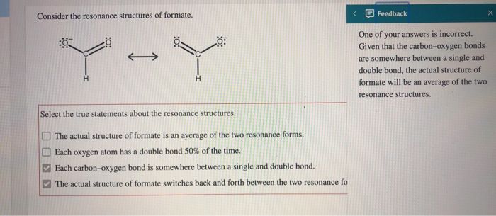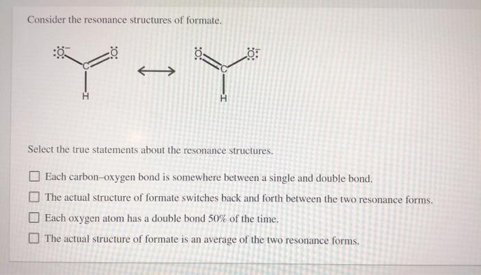 Solved Consider The Resonance Structures Of Formate Select The True Statements About The Resonance Structures The Actual Structure Of Formate Is An Average Of The Two Resonance Forms Each Oxygen Atom Has A